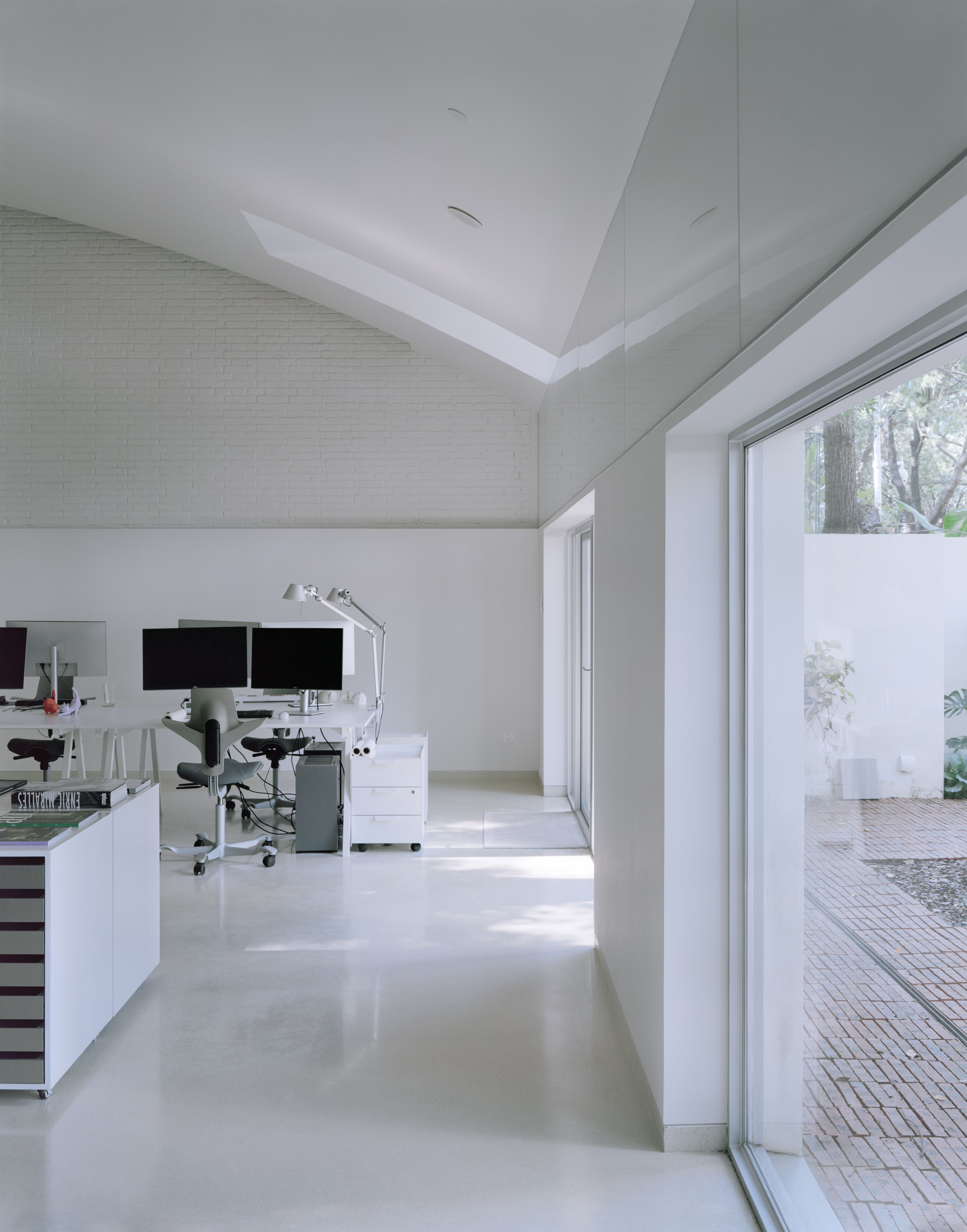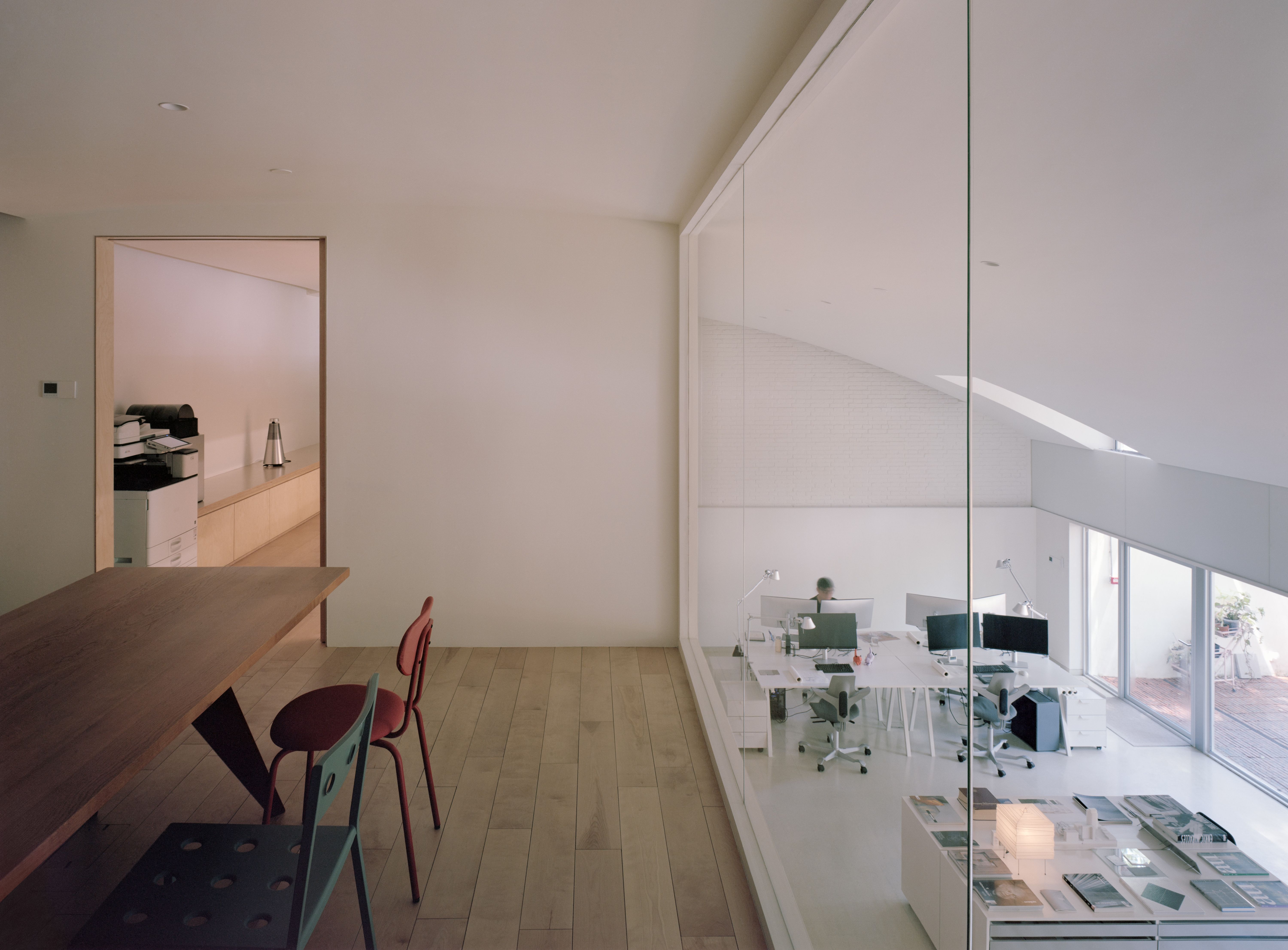 The design of the office is derived from a derelict artist studio shed.At the first encounter, the space appeared hermetic and dim: an east-facing double-heightspace with a mezzanine level that admitted only the muted light of low tinteddoors and windows. Introducing light through new apertures was both animperative and instinctive act. Fortunately, the two existing ventilationshafts on the façade provided the structural basis for expanding them into apair of high windows that receive and diffuse natural light, thereby unfoldingthe spatial narrative of the design.