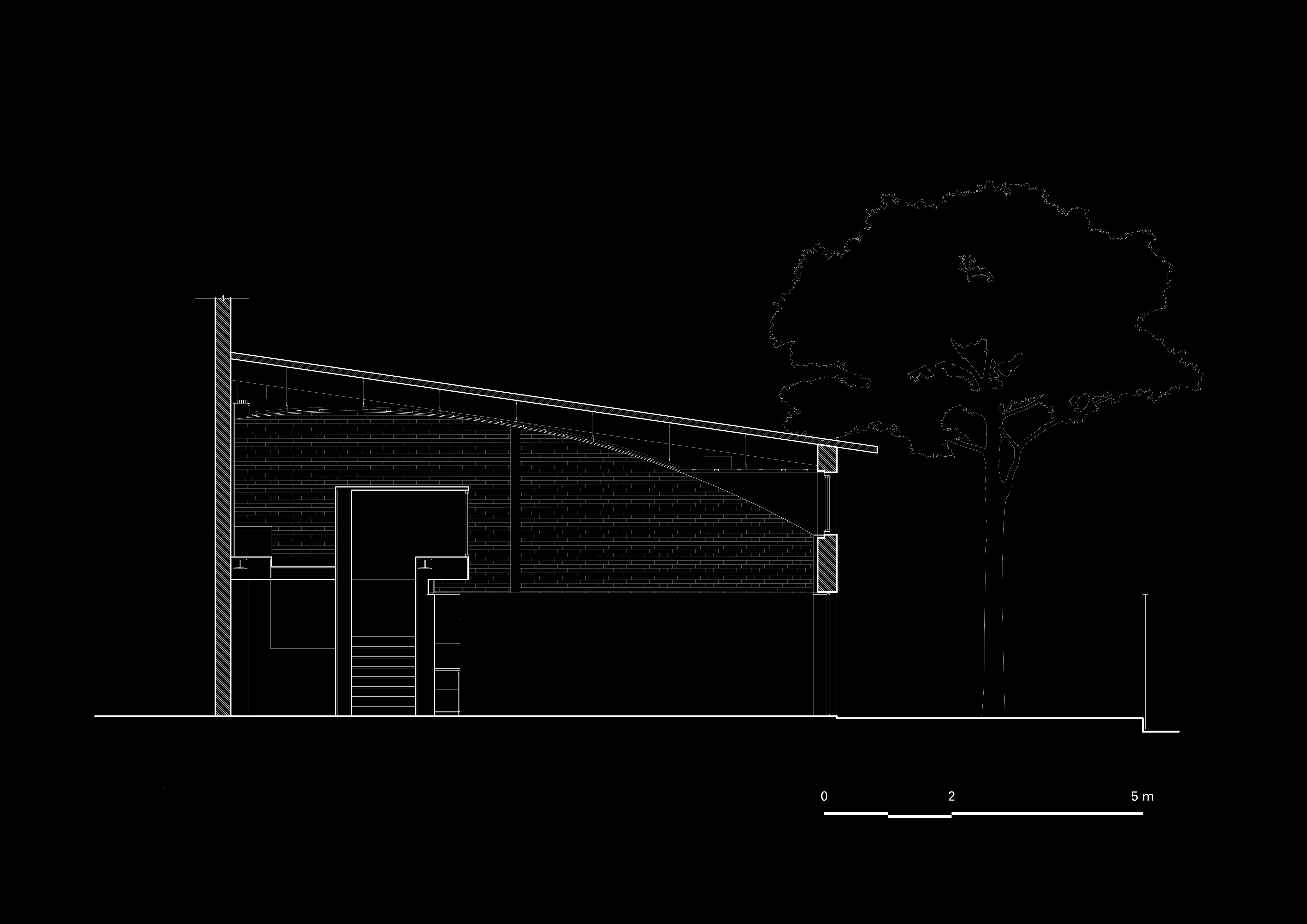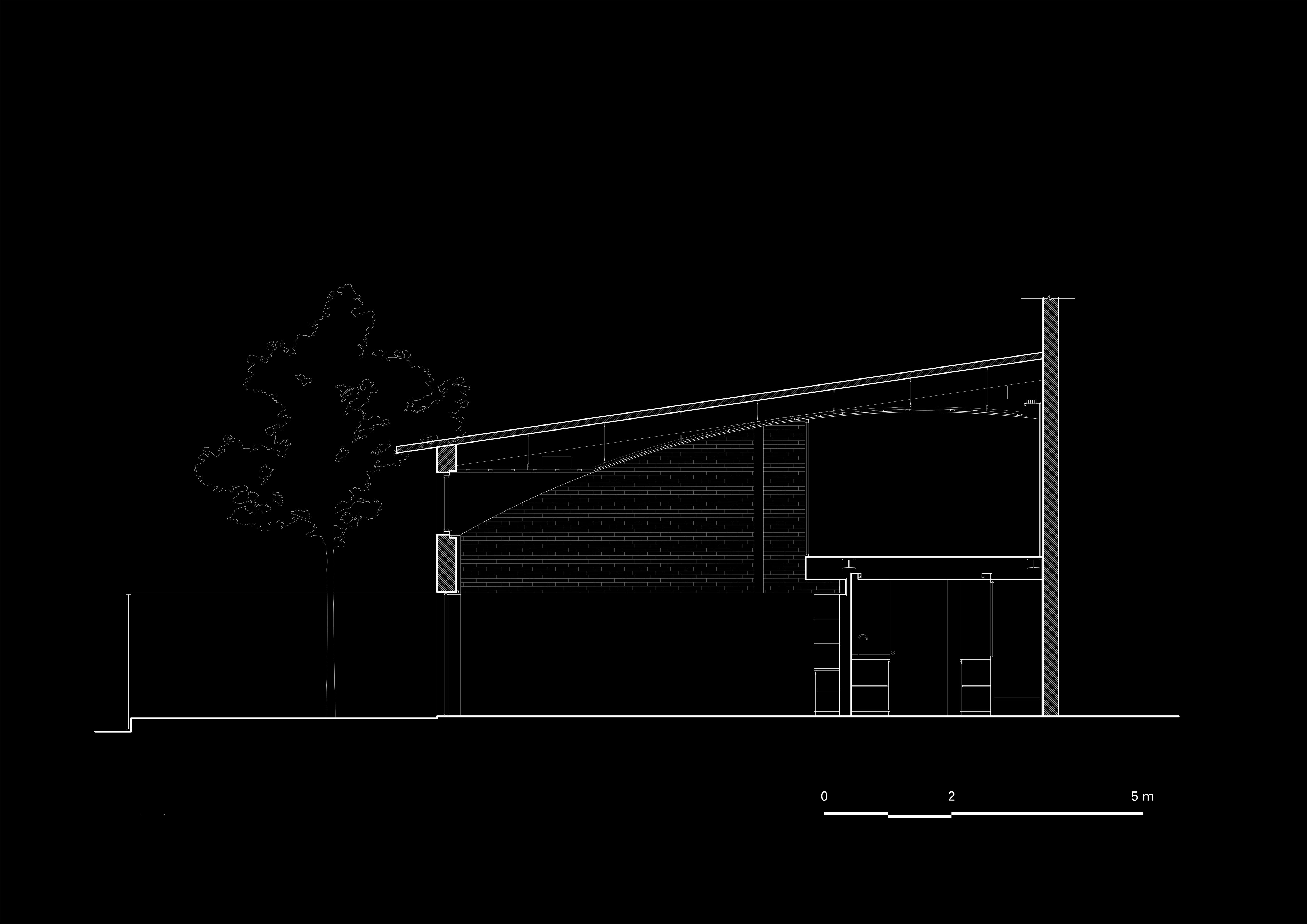 The brick texture registers as a tracethat weaves throughout the site, extending from the wall to the courtyard and resonating with the brickpaved sidewalk. The courtyard itself is slightly elevated and enclosed bylayers of varying permeability: translucent polycarbonate panels along thestreet as a lucid illusion, and above, the canopy of trees filtering light andshadow as an illusionistic lucidity.
