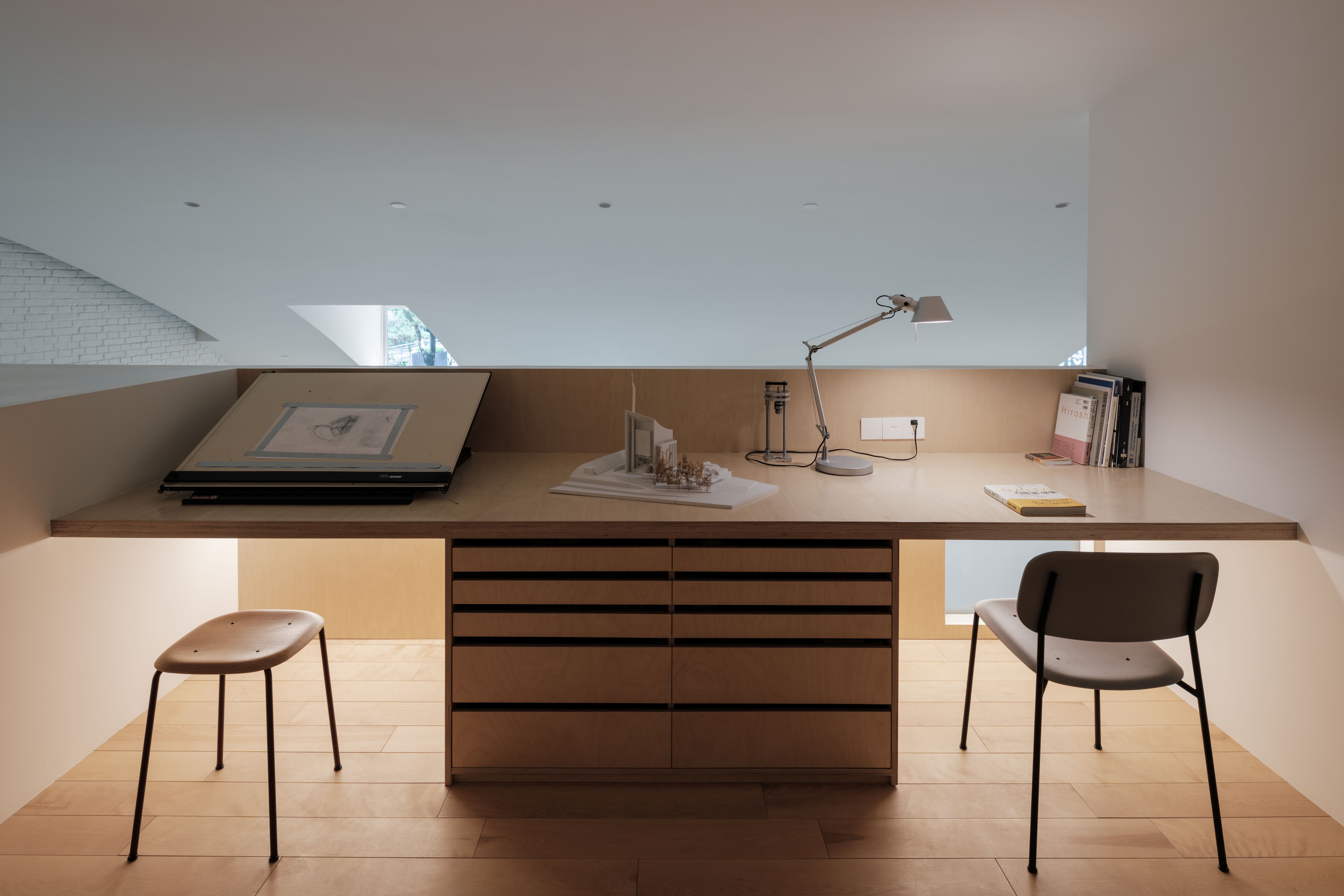 This traversal of light across thethreshold recurs on an interiorized elevation articulated by three windows ofvarying scales. The largest one channels light into the enclosed meeting room,framing and displaying the activities within; the smallest suggests an uncanny,uninhabitable dimension, lit up like a lantern during nighttime. The lastaperture alludes to—and then eludes—the presence of a hidden room, which onlyreveals itself as a concealed staircase once the visitor ascends to the upperlevel. The three windows propose, within one room, varied spatialvitality—whether validated through direct experience or through a vicariousperception.
