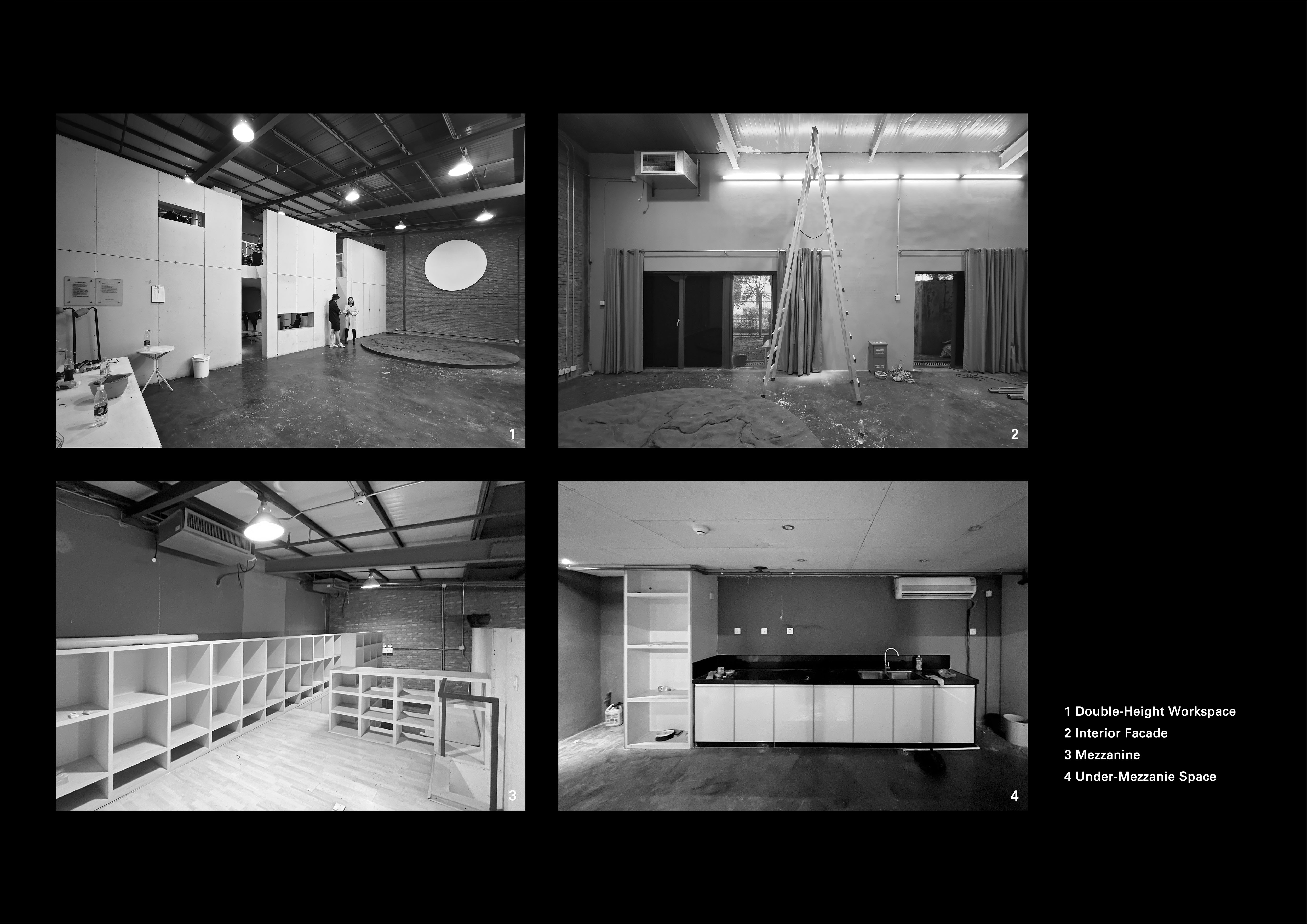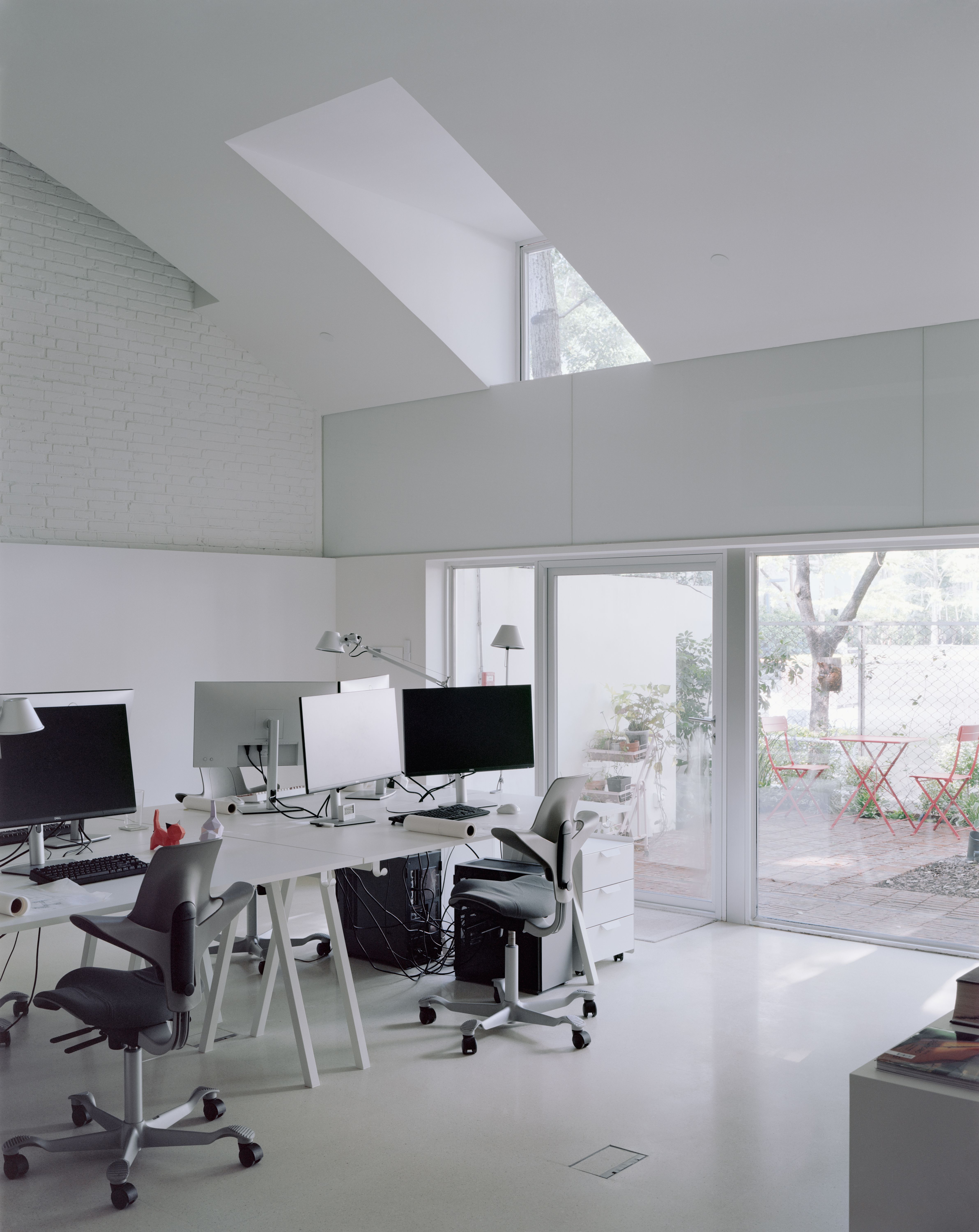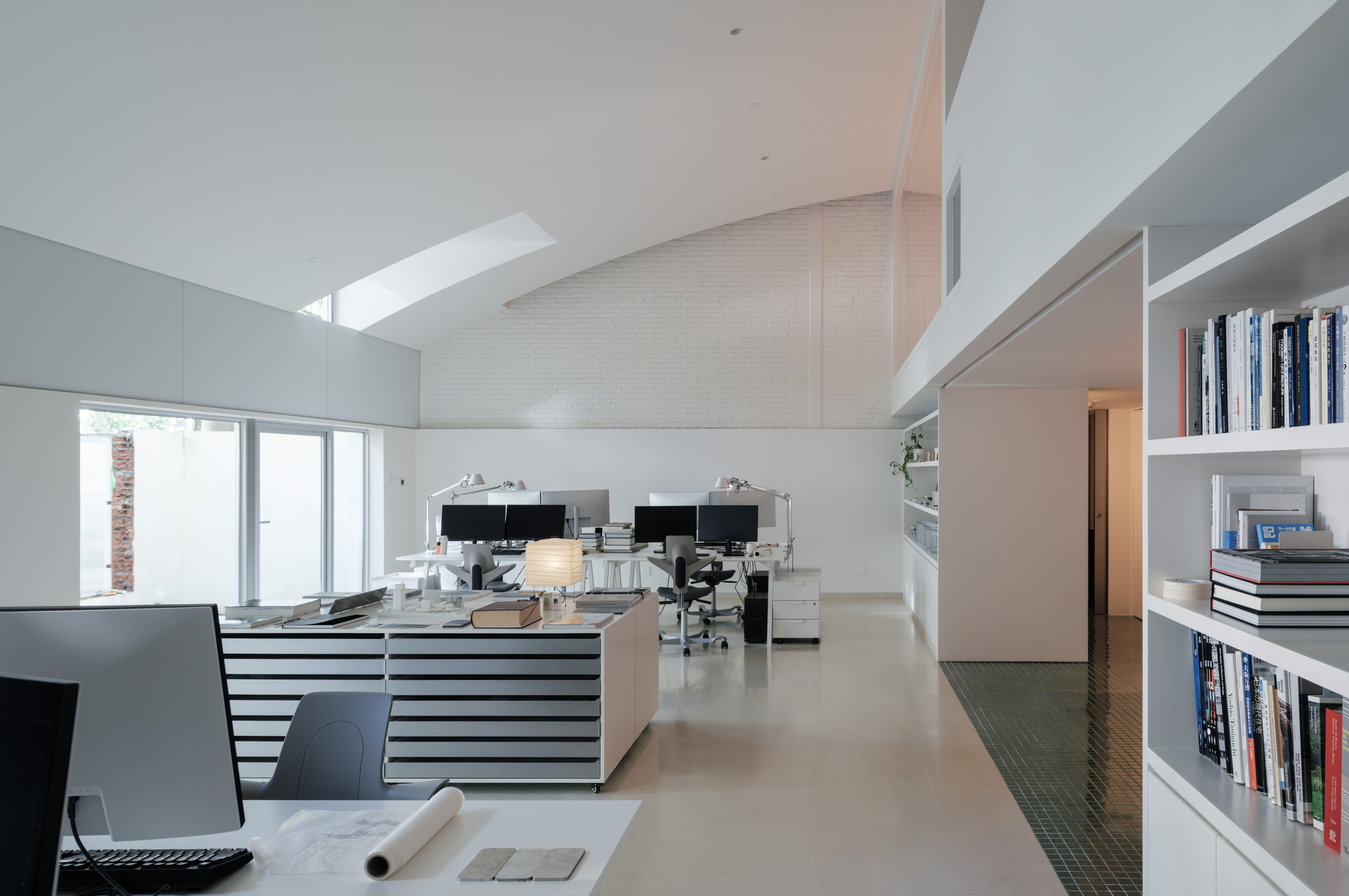 The design of the office is derived from a derelict artist studio shed.At the first encounter, the space appeared hermetic and dim: an east-facing double-heightspace with a mezzanine level that admitted only the muted light of low tinteddoors and windows. Introducing light through new apertures was both animperative and instinctive act. Fortunately, the two existing ventilationshafts on the façade provided the structural basis for expanding them into apair of high windows that receive and diffuse natural light, thereby unfoldingthe spatial narrative of the design.