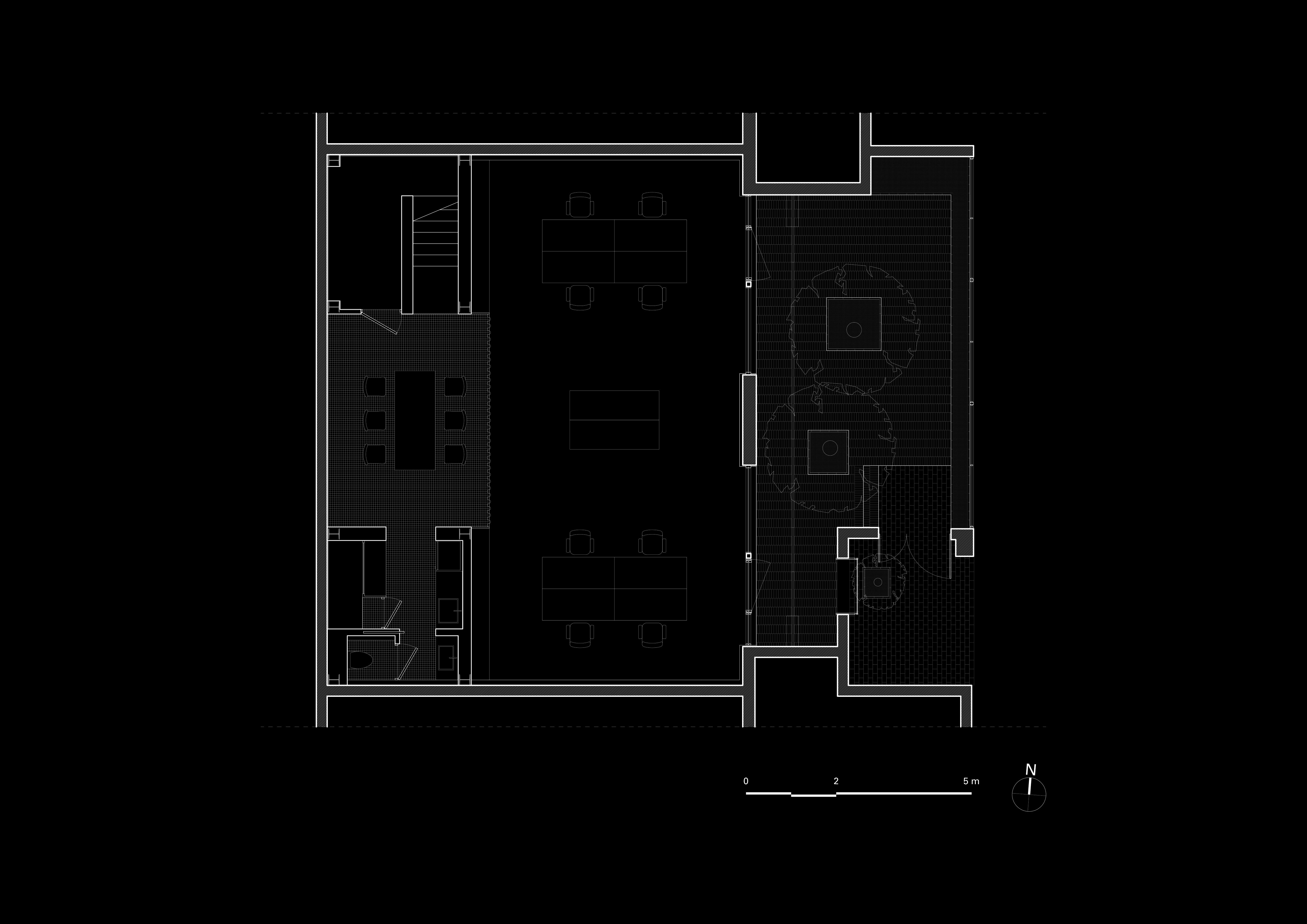 The brick texture registers as a tracethat weaves throughout the site, extending from the wall to the courtyard and resonating with the brickpaved sidewalk. The courtyard itself is slightly elevated and enclosed bylayers of varying permeability: translucent polycarbonate panels along thestreet as a lucid illusion, and above, the canopy of trees filtering light andshadow as an illusionistic lucidity.